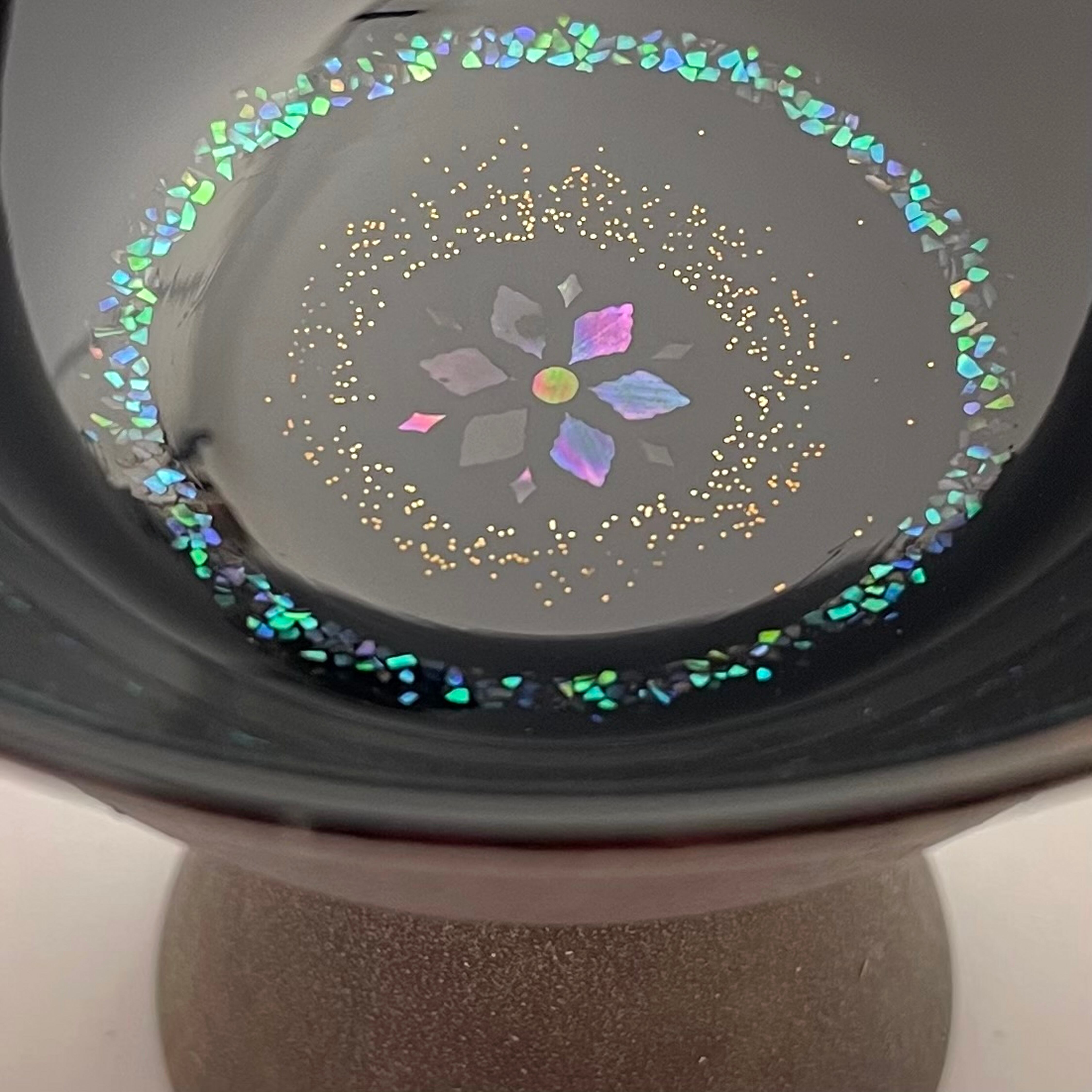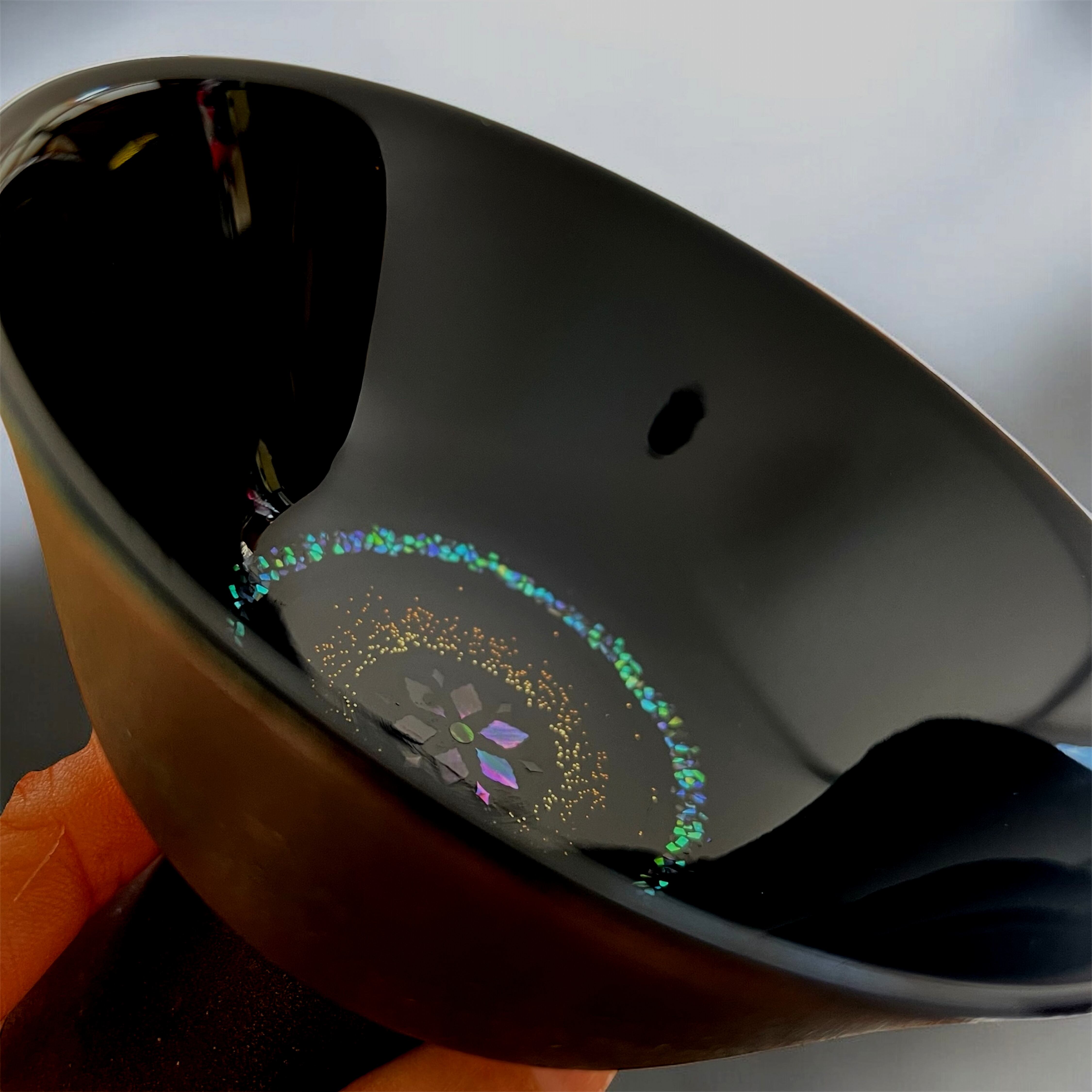 中心から金粉が淡く円を描き、さらに外側へと螺鈿の光がひろがっていきます。